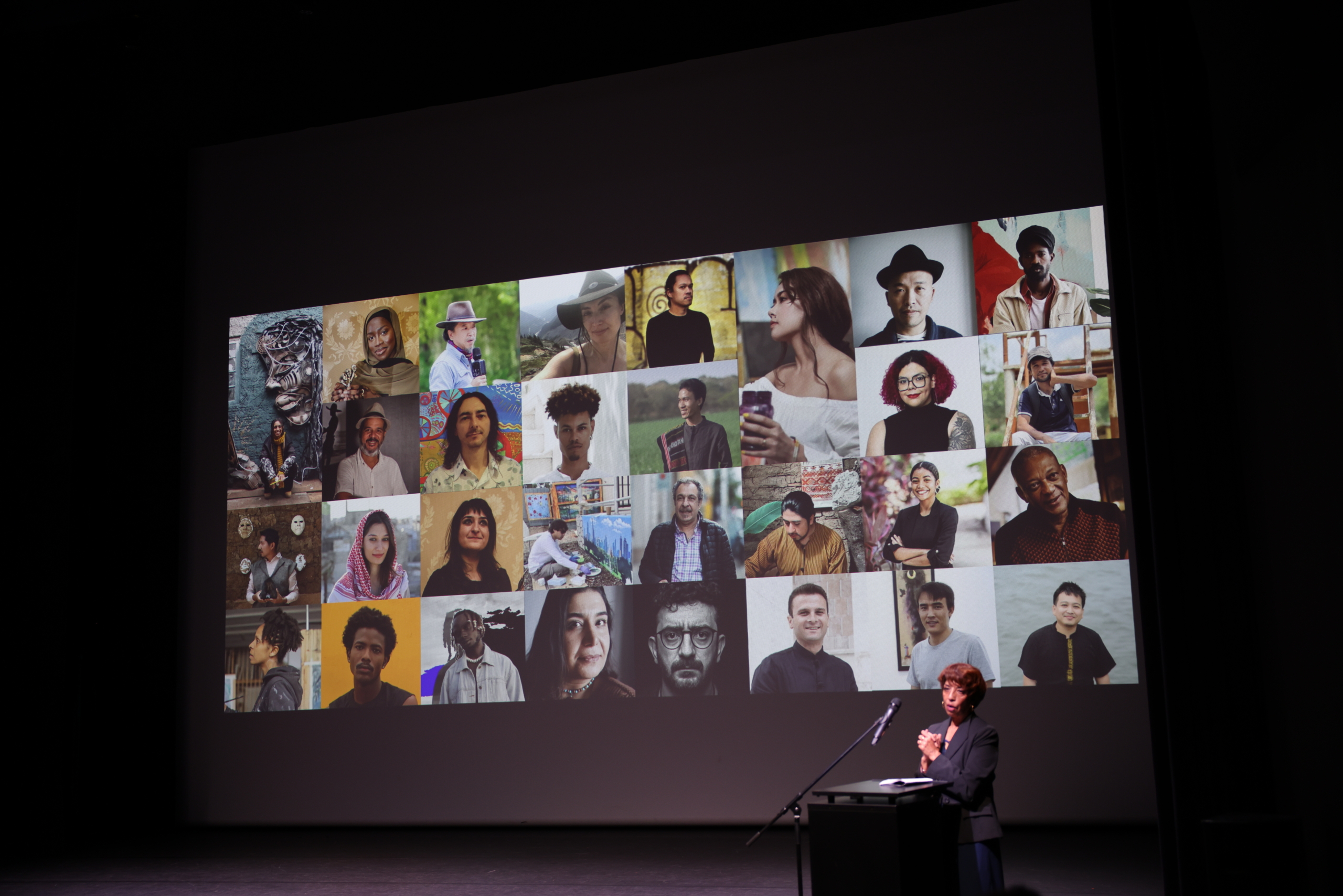 Claire Thomas, Executive Director of Minority Rights Group, joined Yvonne Apiyo Brändle-Amolo on stage to announce the four artists receiving honourable mentions.